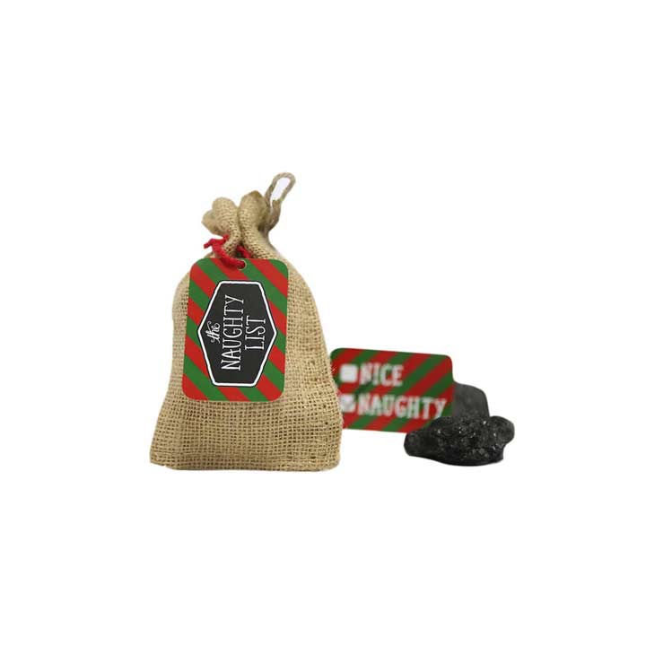 A cool Christmas burlap sack festively filled with small lumps of coal perfect for any time.